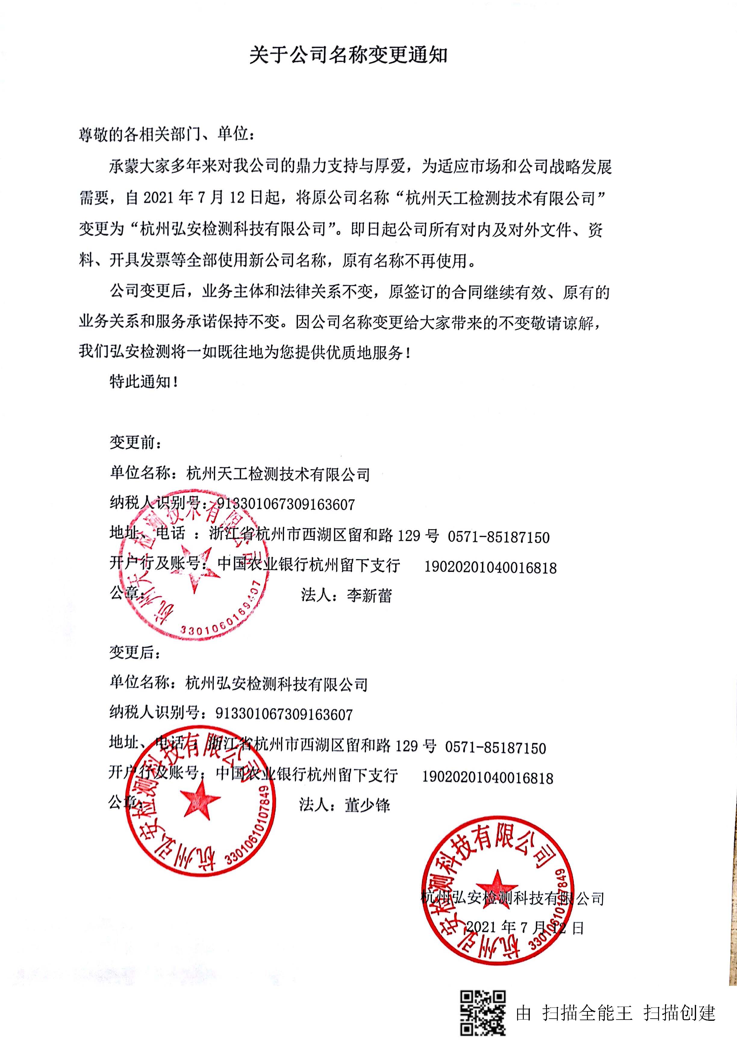 公司从2021年7月12日变更登记为杭州弘安检测科技有限公司之日起,原公司杭州天工检测技术有限公司的检测技术服务业务统一由杭州弘安检测科技有限公司经营,原来签订的业务合同继续有效。即日起,公司所有对内